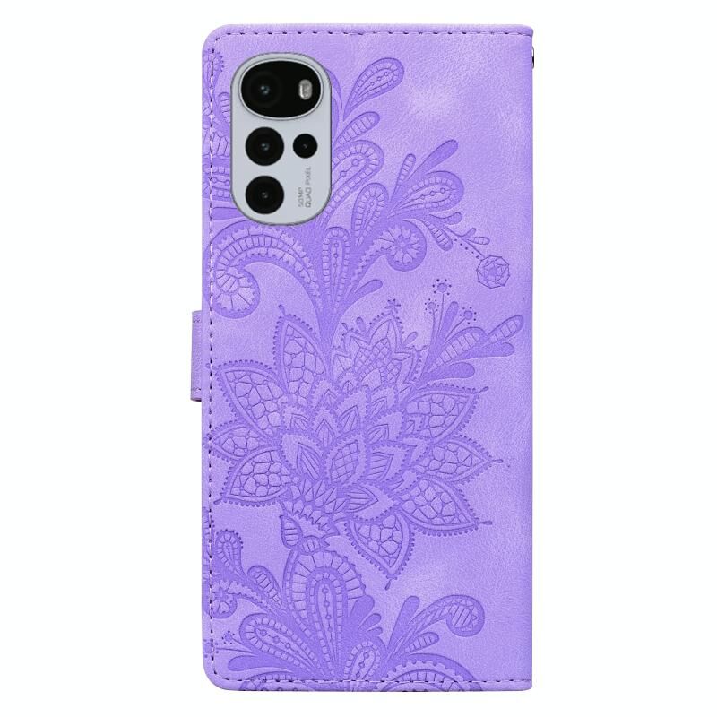Θήκη κινητού τηλεφώνου Motorola Moto G22 με δαντέλα, λουλουδάτο ανάγλυφο, μαγνητικό κούμπωμα και λουρί καρπού (Πράσινο)