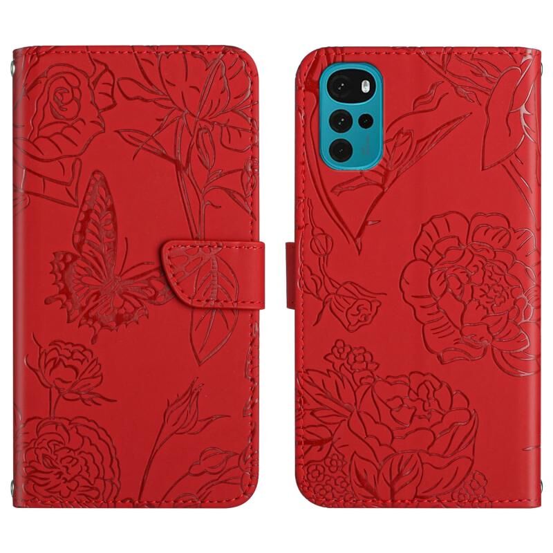 Θήκη κινητού τηλεφώνου από δέρμα με ανάγλυφο σχέδιο πεταλούδας και παιώνιας για Motorola Moto G22 (Κόκκινο)