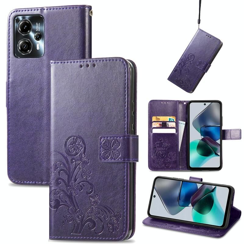 Για Motorola Moto G23 τετράφυλλο κούμπωμα ανάγλυφο αγκράφα δερμάτινη θήκη τηλεφώνου (μωβ)