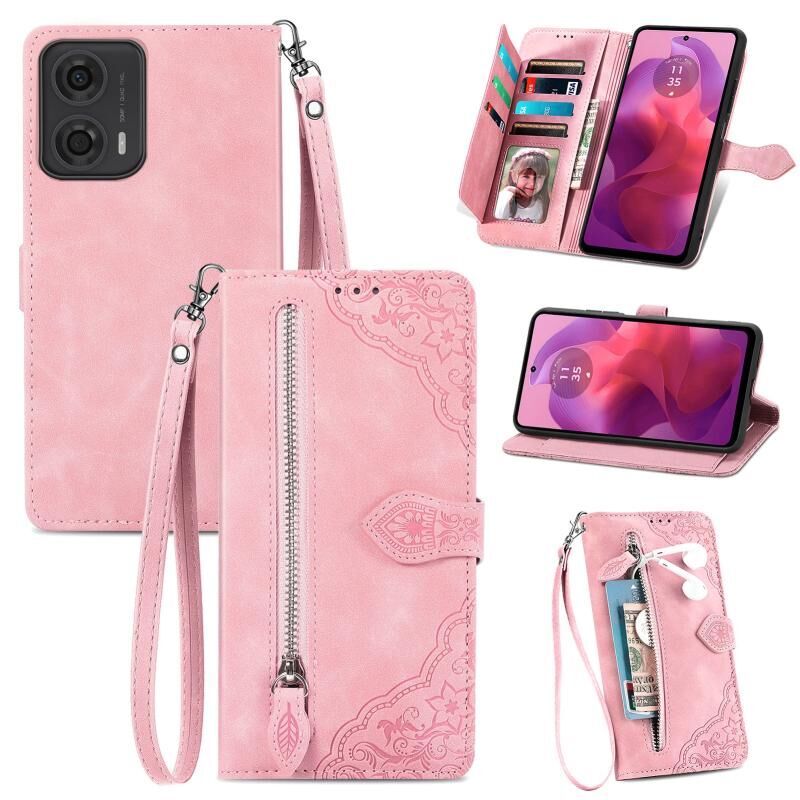 Θήκη κινητού τηλεφώνου δερμάτινη με φερμουάρ και ανάγλυφο λουλούδι για Motorola Moto G24 (Ροζ)
