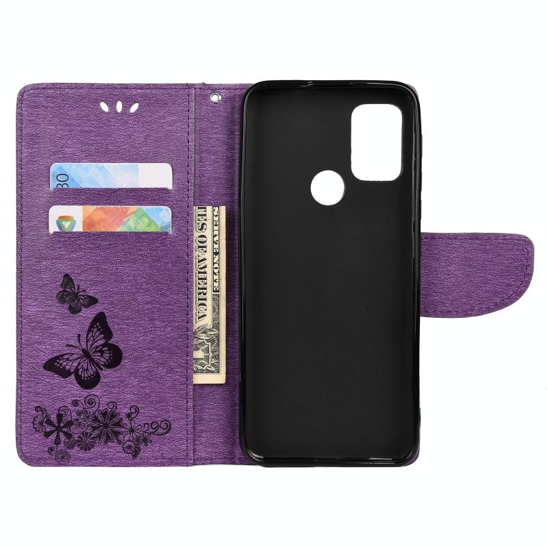 Θήκη δέρματος οριζόντιας αναδίπλωσης με ανάγλυφο σχέδιο πεταλούδας για Motorola Moto G30 με βάση & υποδοχές καρτών & πορτοφόλι (Μαύρο)