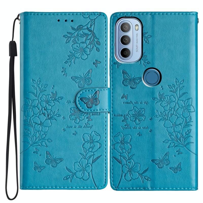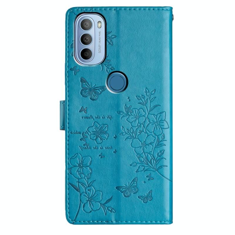 Θήκη τηλεφώνου δερμάτινη για Motorola Moto G31 / G41 με σχέδια πεταλούδες και λουλούδια (Μπλε)