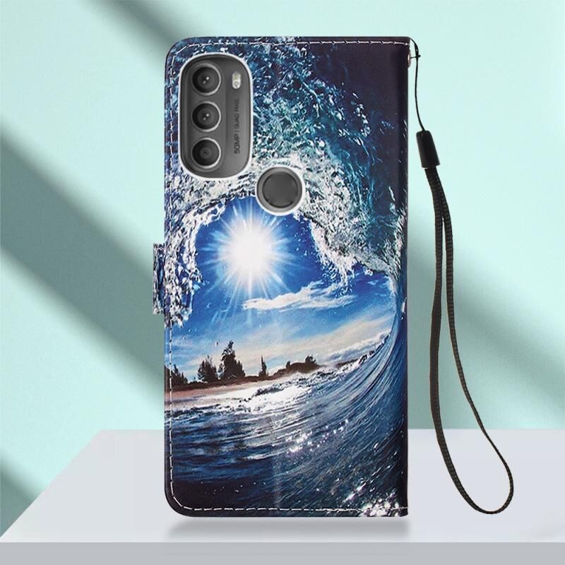 Θήκη κινητού τηλεφώνου από δέρμα με απλή ύφανση και έγχρωμο σχέδιο για Motorola Moto G31 / G41 (Κύματα και Ήλιος)
