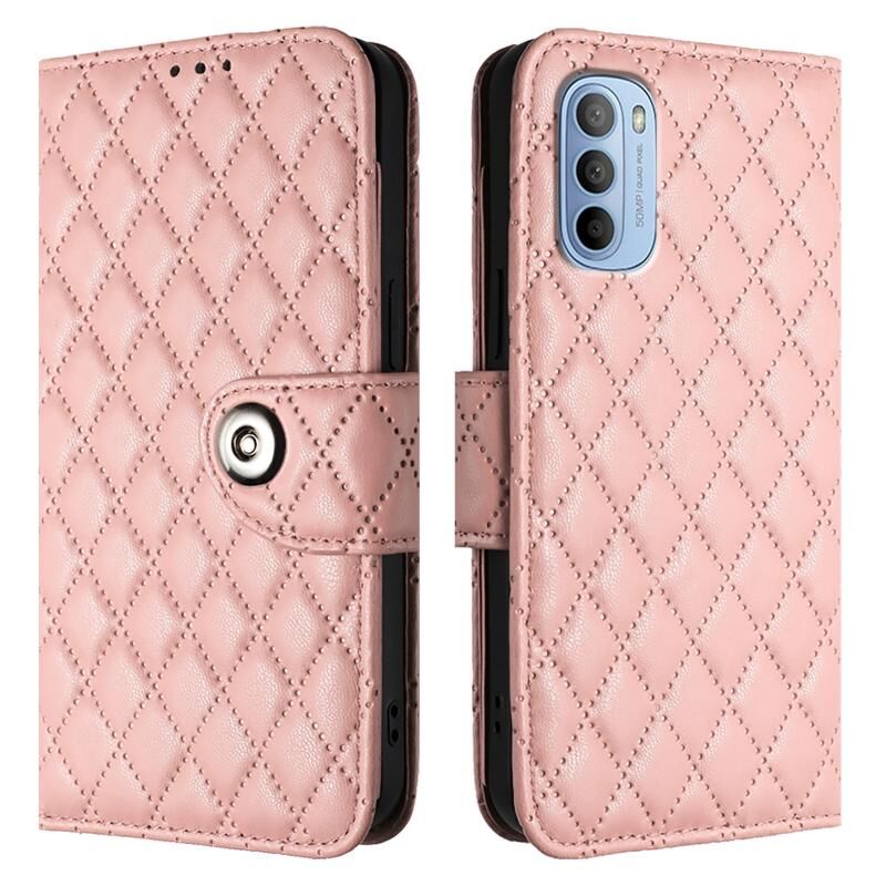 Για Motorola Moto G31 / G41 Rhombic Texture Flip δερμάτινη θήκη τηλεφώνου με κορδόνι (Coral Pink)