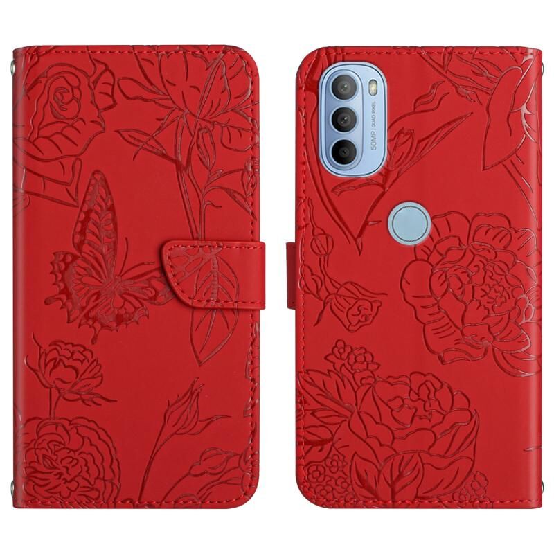 Θήκη τηλεφώνου από δέρμα με ανάγλυφο σχέδιο πεταλούδας και παιώνιας για Motorola Moto G31 / G41 (Κόκκινο)