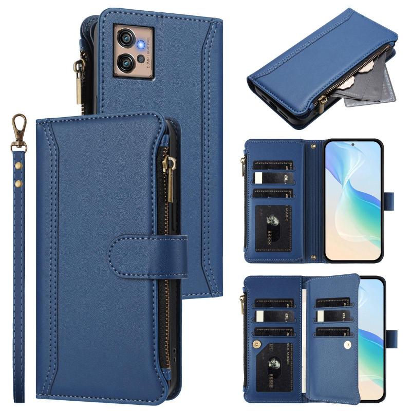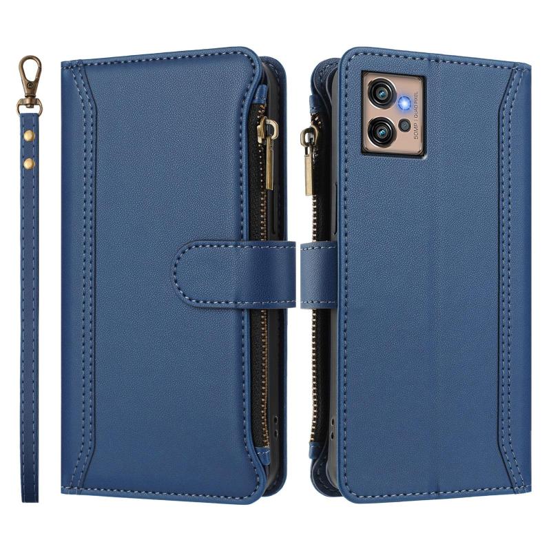 For Motorola Moto G32 Magnetic Closure 9 Card Slots Zipper Leather Case with Hand Strap(Dark Blue)
