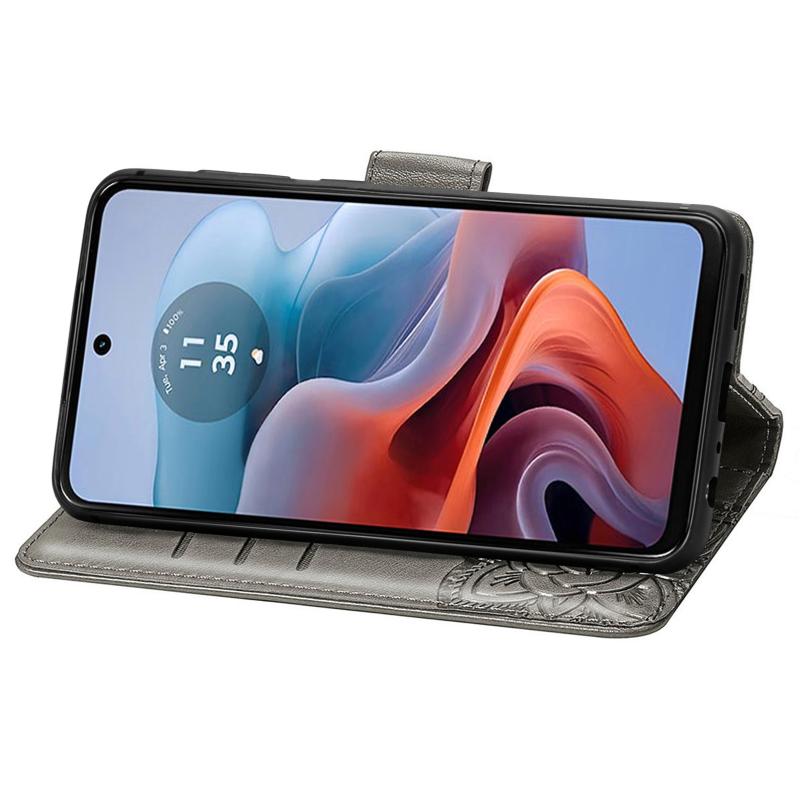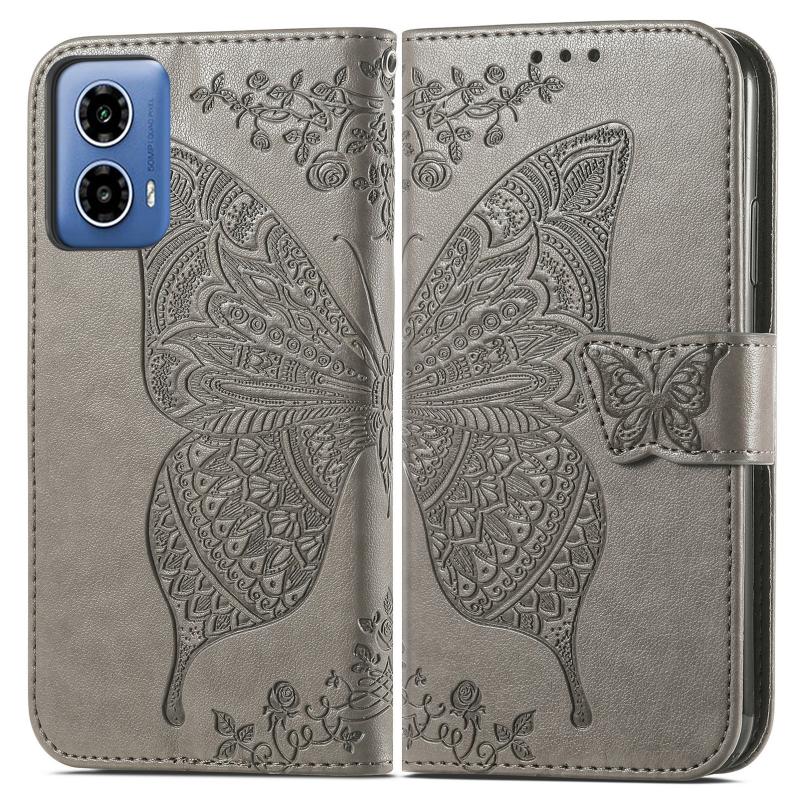 For Motorola Moto G34 Butterfly Love Flower Embossed Leather Phone Case(Gray)