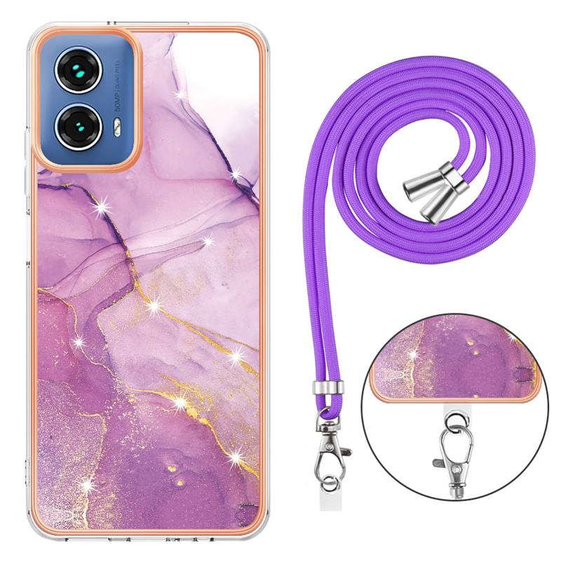 For Motorola Moto G34 Electroplating Marble Dual-side IMD Phone Case with Lanyard(Purple 001)