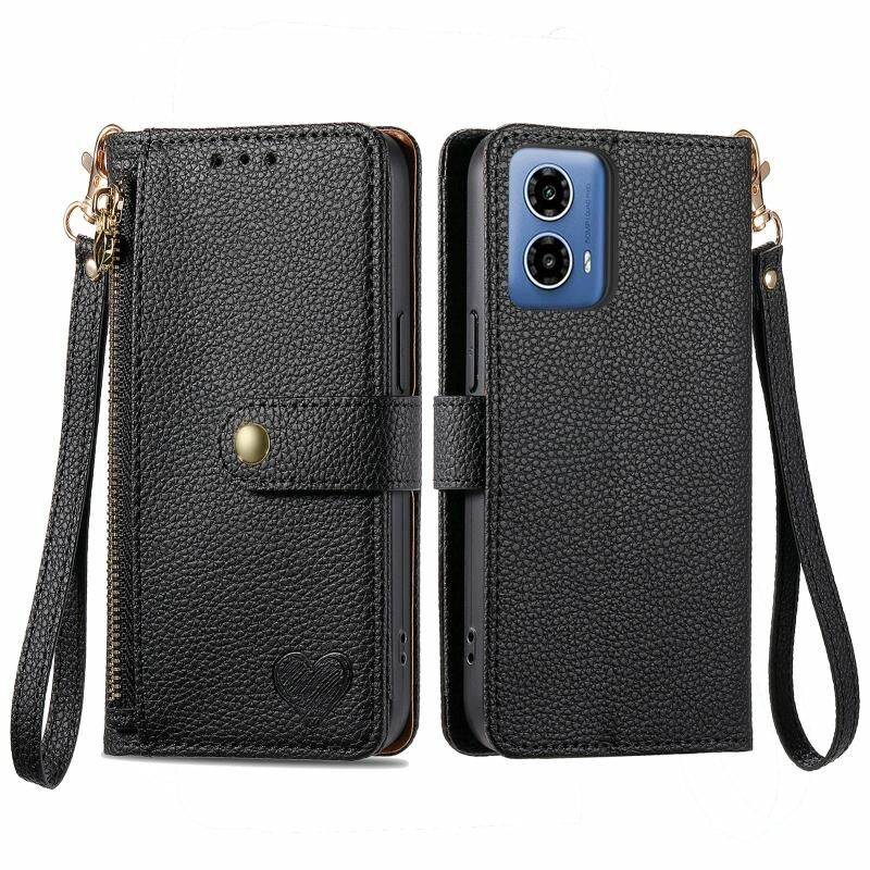 Για Motorola Moto G34 Θήκη Δερμάτινη με Λουρί και Φερμουάρ Love (Μαύρο)