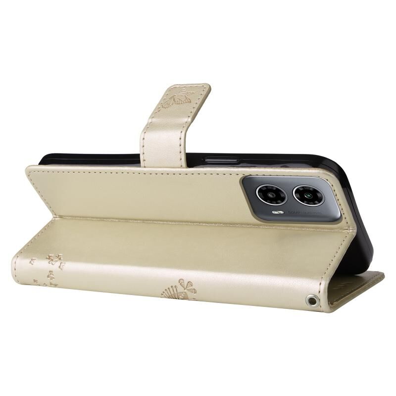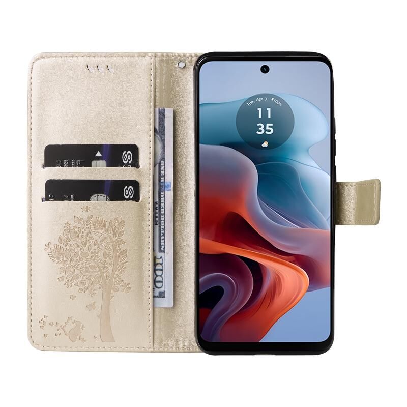 Θήκη τηλεφώνου δερμάτινη, τύπου flip, με ανάγλυφο σχέδιο δέντρου & γάτας για Motorola Moto G34 (Ροζ)