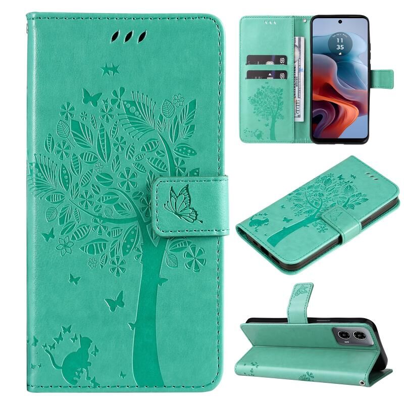 Θήκη τηλεφώνου δερμάτινη, τύπου flip, με ανάγλυφο σχέδιο δέντρου & γάτας για Motorola Moto G34 (Ροζ)