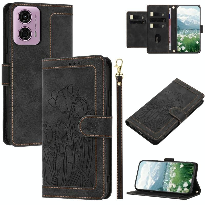 Θήκη κινητού τηλεφώνου από δέρμα με ανάγλυφα τουλίπες για Motorola Moto G34 με κορδόνι (Μωβ)
