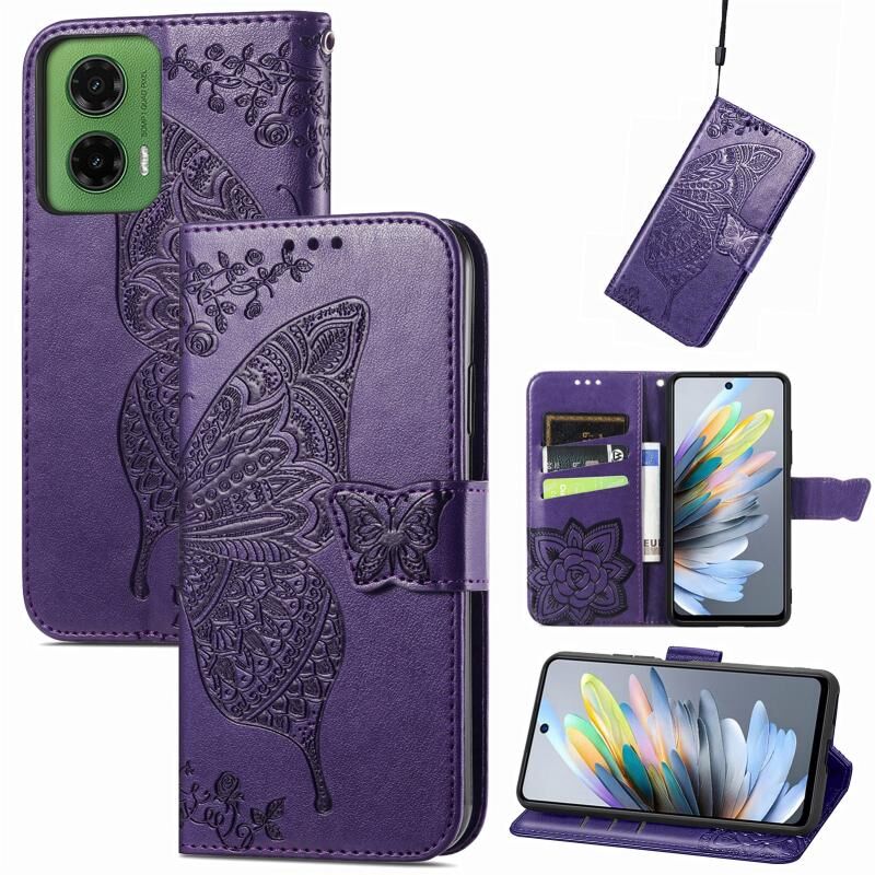Θήκη τηλεφώνου δερμάτινη ανάγλυφη με σχέδιο πεταλούδας και λουλουδιών για Motorola Moto G35 (Μαύρο)