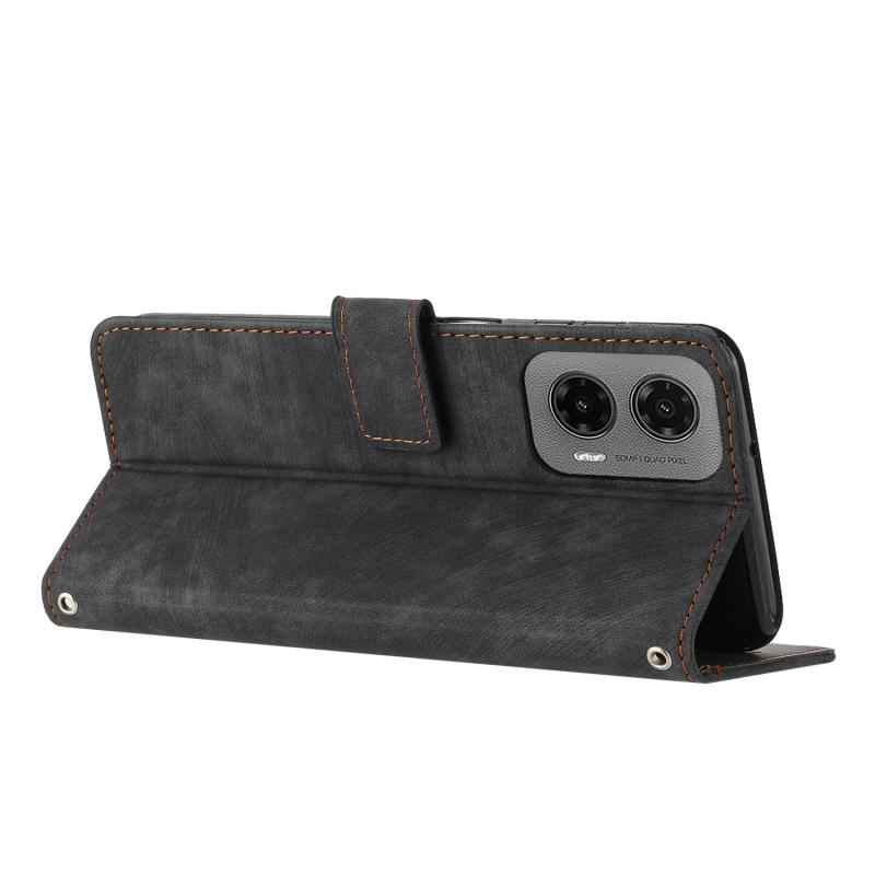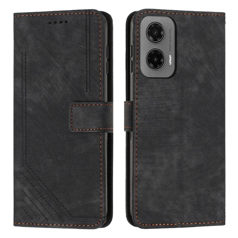 For Motorola Moto G35 Skin Feel Stripe Pattern Leather Phone Case with Lanyard(Black)