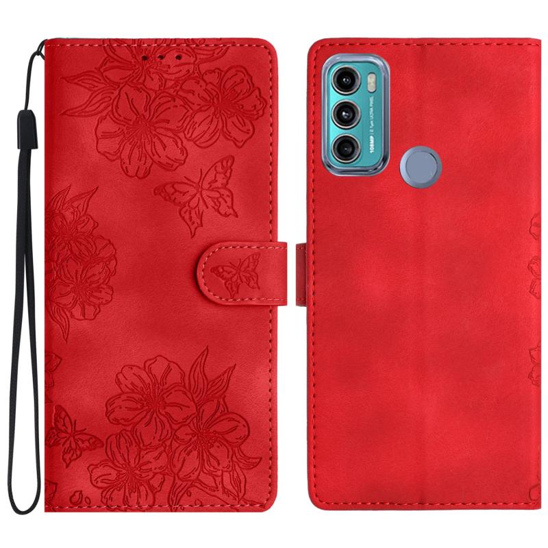 For Motorola Moto G40 Fusion Cherry Blossom Butterfly Skin Feel Embossed PU Phone Case(Red)