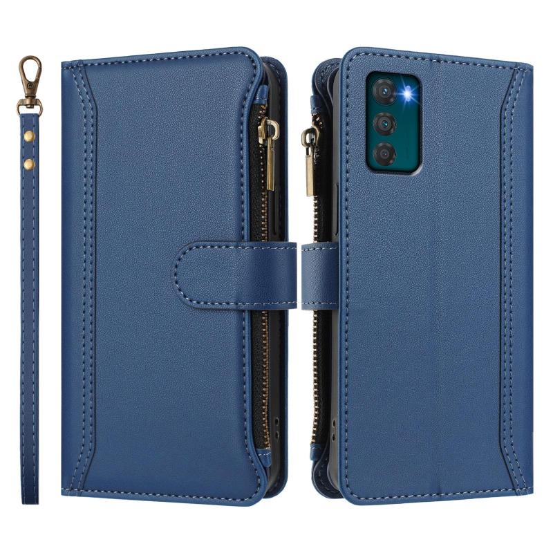 For Motorola Moto G42 4G Magnetic Closure 9 Card Slots Zipper Leather Case with Hand Strap(Dark Blue)