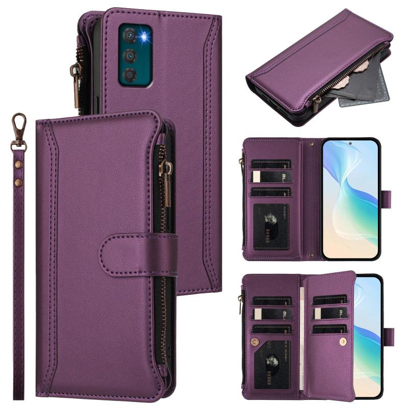For Motorola Moto G42 4G Magnetic Closure 9 Card Slots Zipper Leather Case with Hand Strap(Purple)