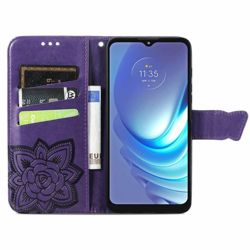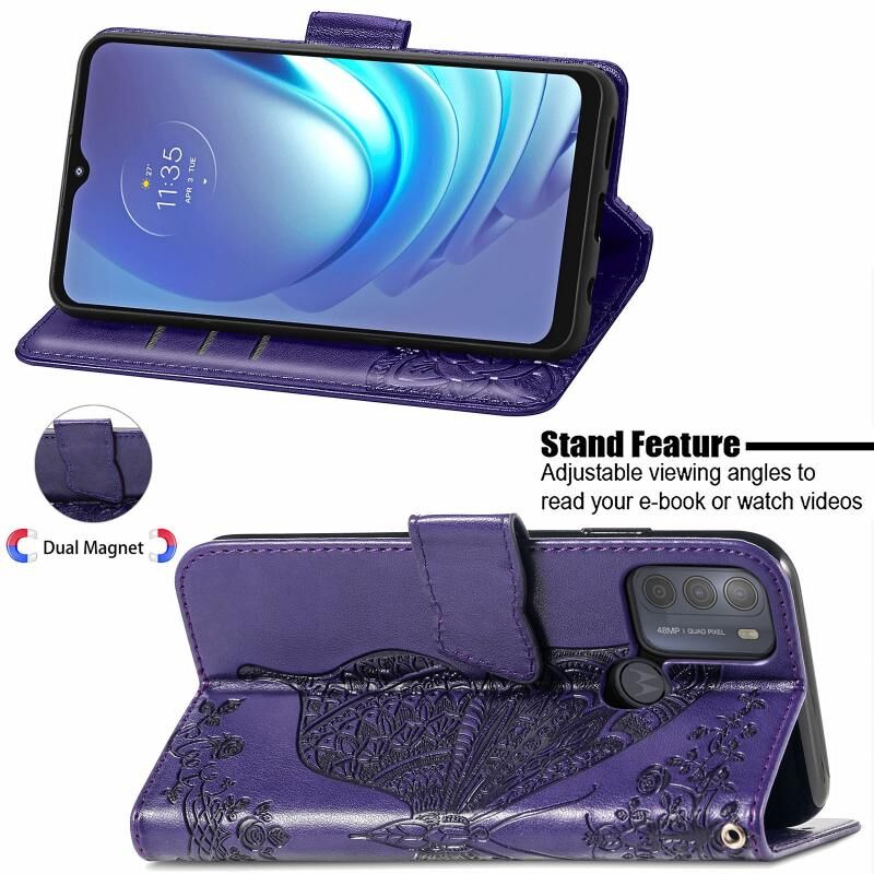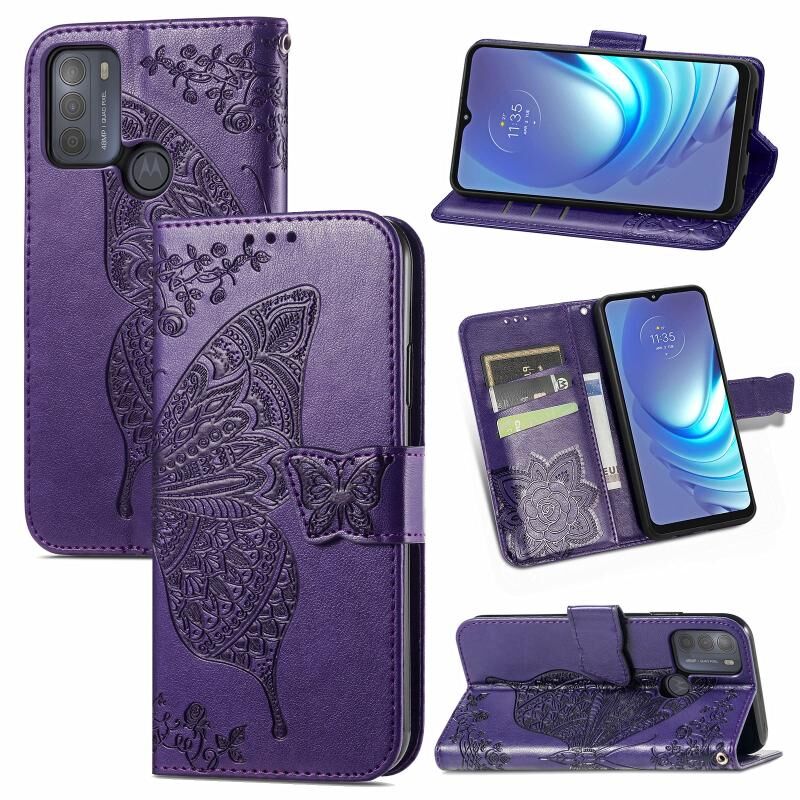 Για Motorola Moto G50 Πεταλούδα αγάπη λουλούδια ανάγλυφο οριζόντια Flip δερμάτινη θήκη με κάτοχο & υποδοχές για κάρτες & πορτοφόλι & κορδόνι (σκούρο μωβ)