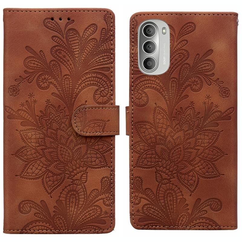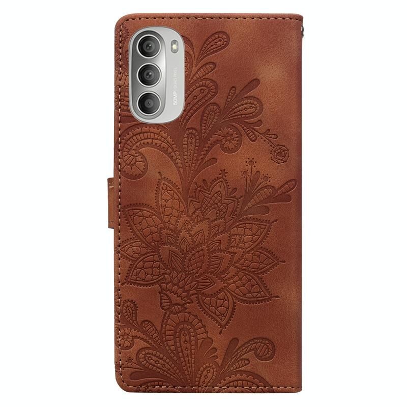 Θήκη κινητού τηλεφώνου Motorola Moto G51 5G από PU με μαγνητικό κούμπωμα, δαντελένιο floral ανάγλυφο και λουρί καρπού (Πράσινο)