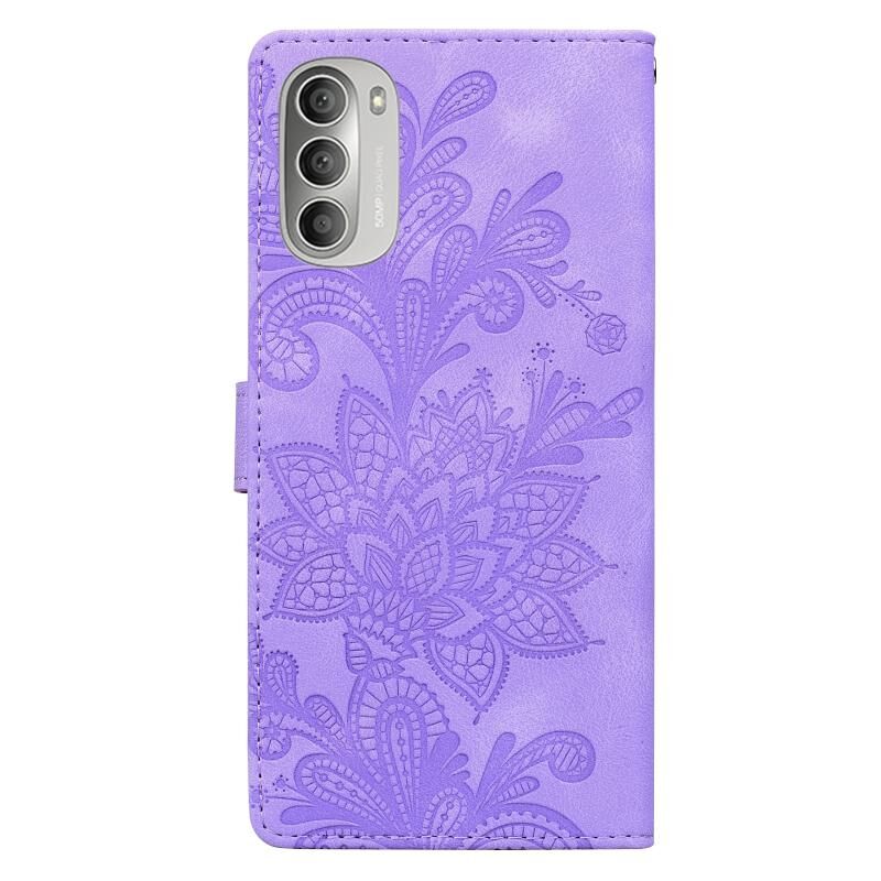 Θήκη κινητού τηλεφώνου Motorola Moto G51 5G από PU με μαγνητικό κούμπωμα, δαντελένιο floral ανάγλυφο και λουρί καρπού (Πράσινο)