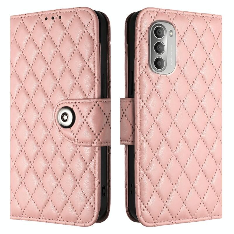 Για Motorola Moto G51 5G Rhombic Texture Flip δερμάτινη θήκη τηλεφώνου με κορδόνι (ροζ κοραλλί)