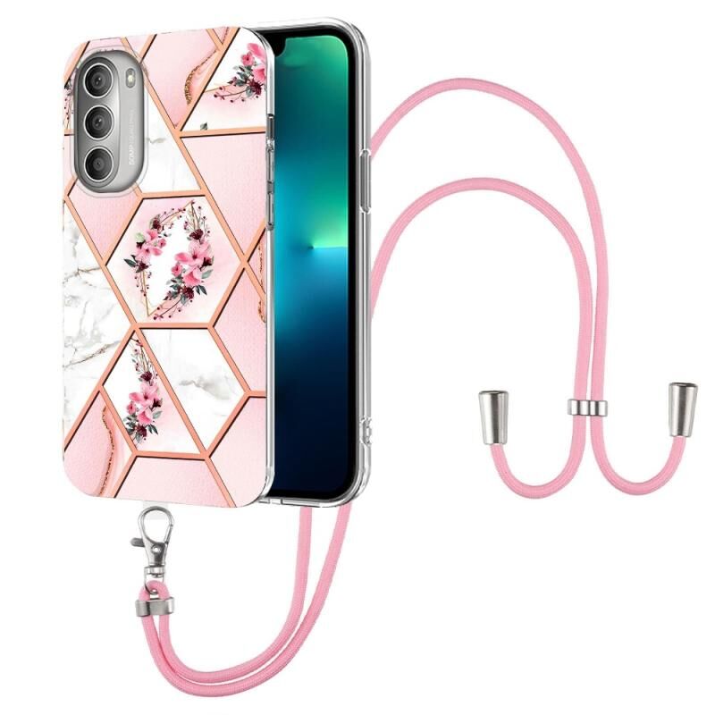 Θήκη τηλεφώνου TPU με σχέδιο μαρμάρου και λουλουδιών για Motorola Moto G51 5G με κορδόνι (Ροζ Λουλούδι)