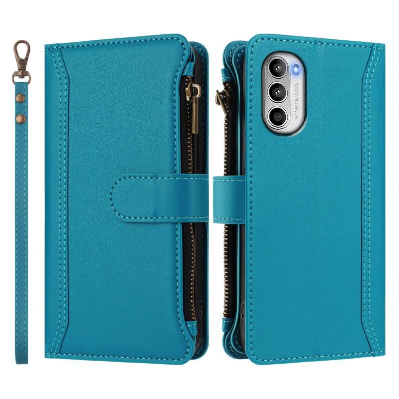 Για Motorola Moto G52 4G / G82 5G / G71S 5G Μαγνητικό Κλείσιμο 9 Θήκες Κάρτας Φερμουάρ Δερμάτινη Θήκη με Λουρί Χεριού (Τουρκουάζ)