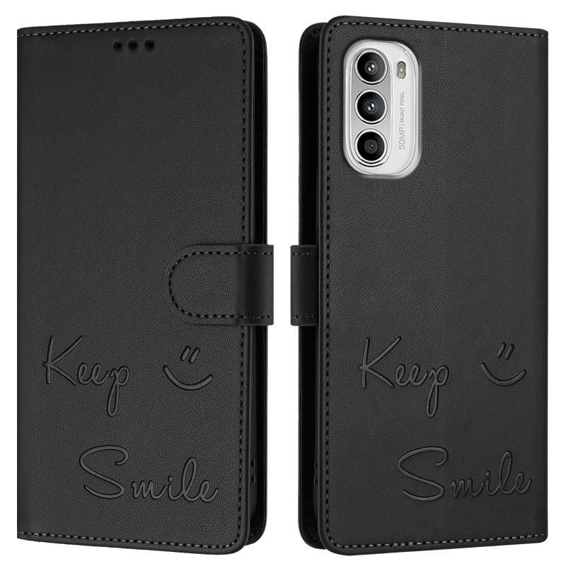 Θήκη τηλεφώνου από δέρμα με ανάγλυφο χαμόγελο και RFID για Motorola Moto G52 4G/G82 5G/G71s 5G (Μαύρο)
