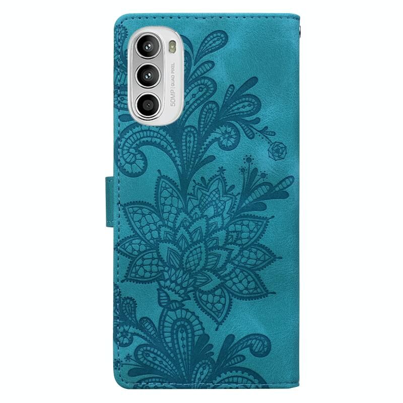 Θήκη κινητού τηλεφώνου Motorola Moto G52 4G / G82 με σχέδιο δαντέλας και λουλούδια, ανάγλυφη, με μαγνητικό κούμπωμα και λουρί καρπού (Πράσινο)