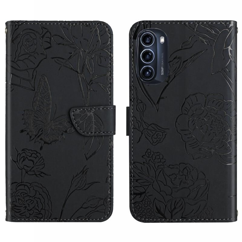 Θήκη τηλεφώνου από δέρμα με ανάγλυφο σχέδιο πεταλούδας και παιώνιας για Motorola Moto G52J 5G (Μαύρο)