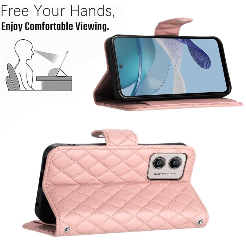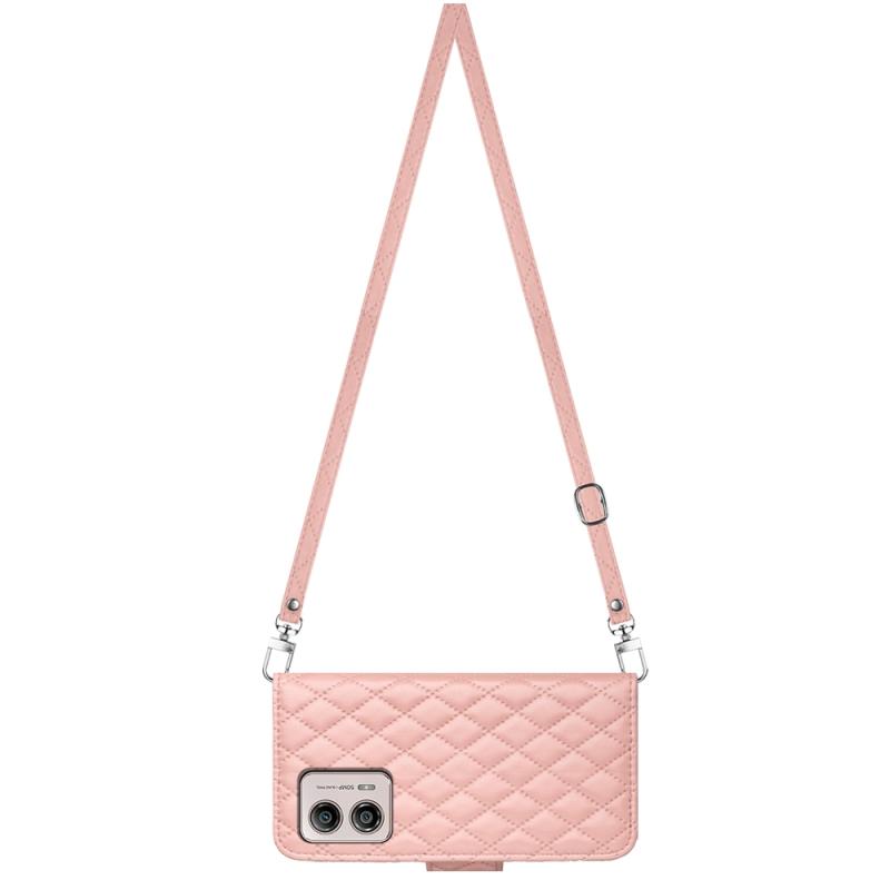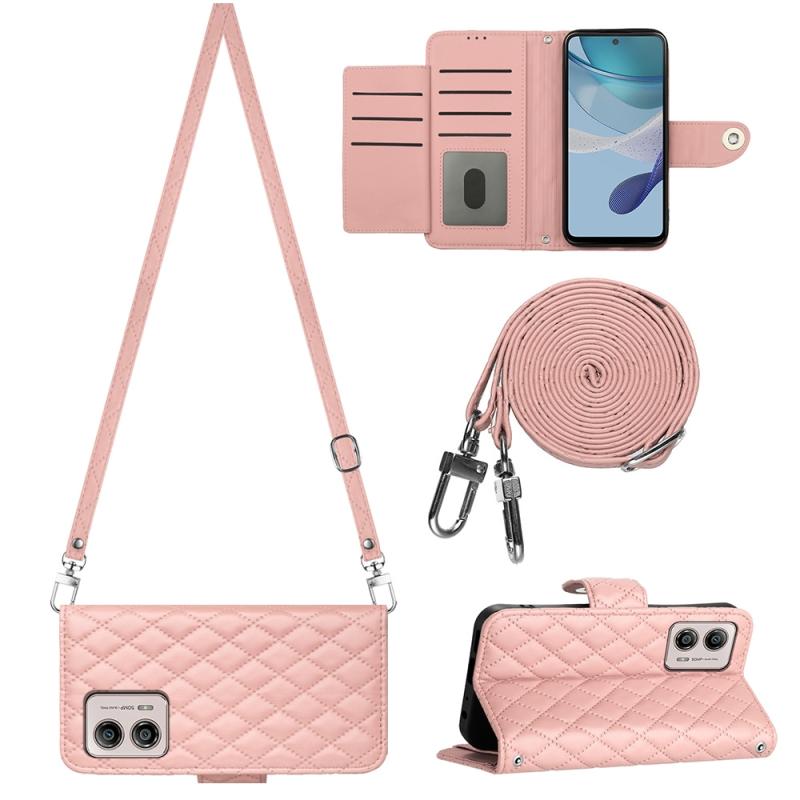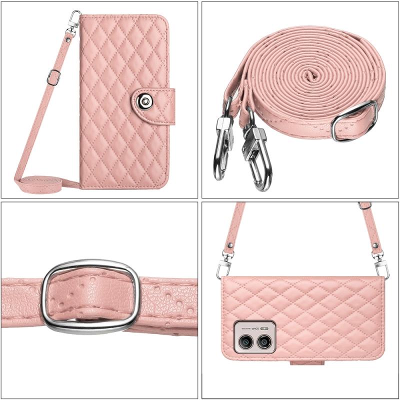 For Motorola Moto G53 / G23 / G13 Rhombic Texture Flip Leather Phone Case with Long Lanyard(Coral Pink)