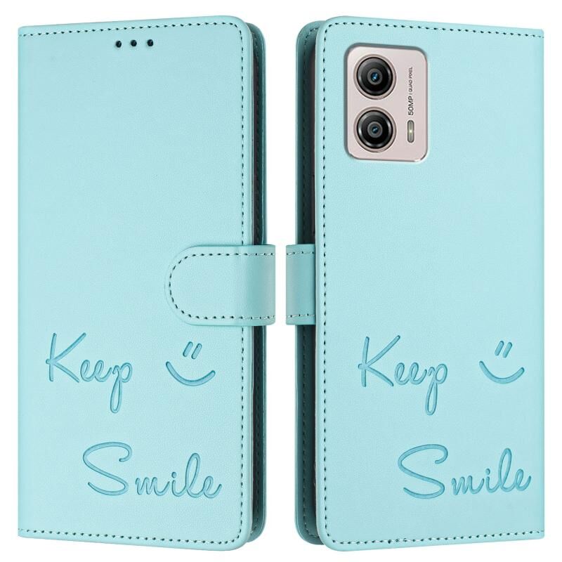 Θήκη τηλεφώνου δερμάτινη με ανάγλυφο χαμόγελο RFID για Motorola Moto G53Y 5G/G53J 5G (Μέντας Πράσινο)