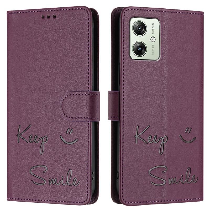 Θήκη τηλεφώνου δερμάτινη με ανάγλυφο χαμόγελο και RFID για Motorola Moto G54 έκδοση Βραζιλίας (Βιολετί)