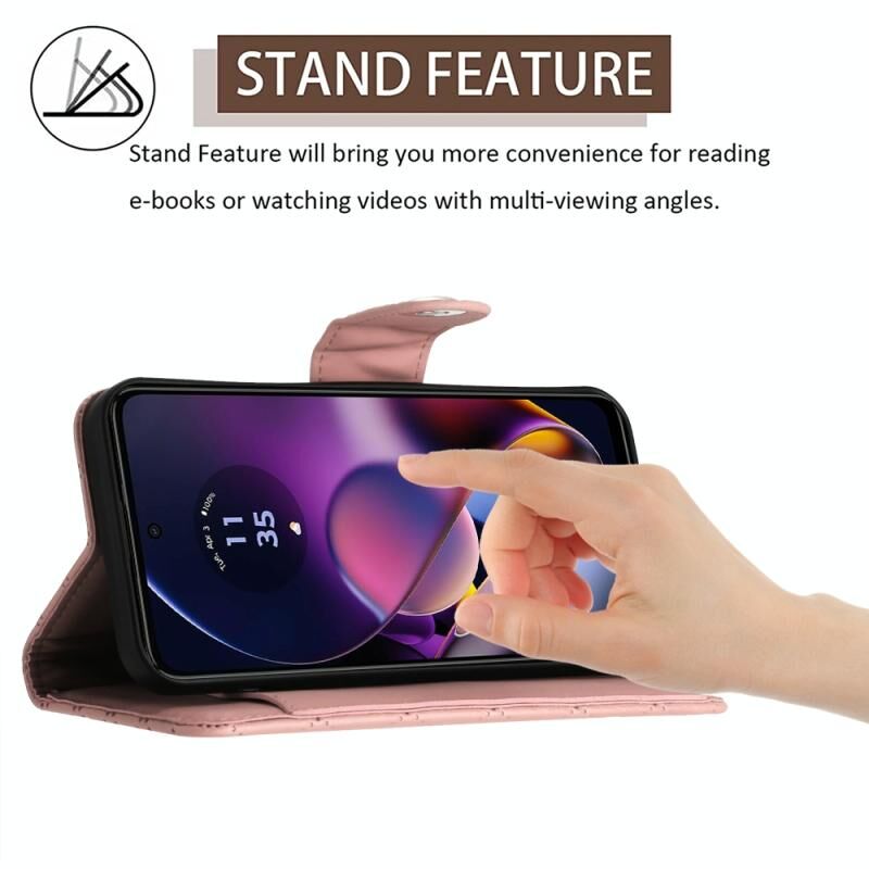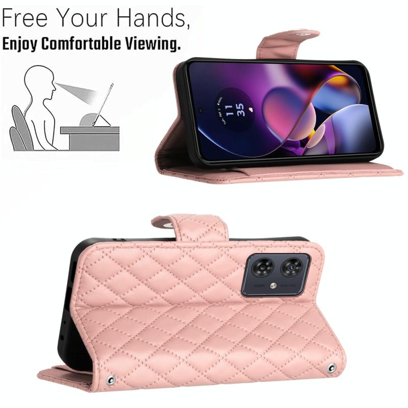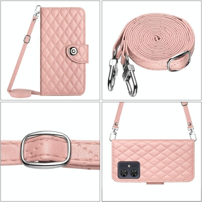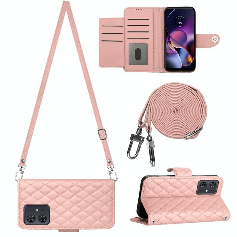 For Motorola Moto G54 Rhombic Texture Flip Leather Phone Case with Long Lanyard(Coral Pink)