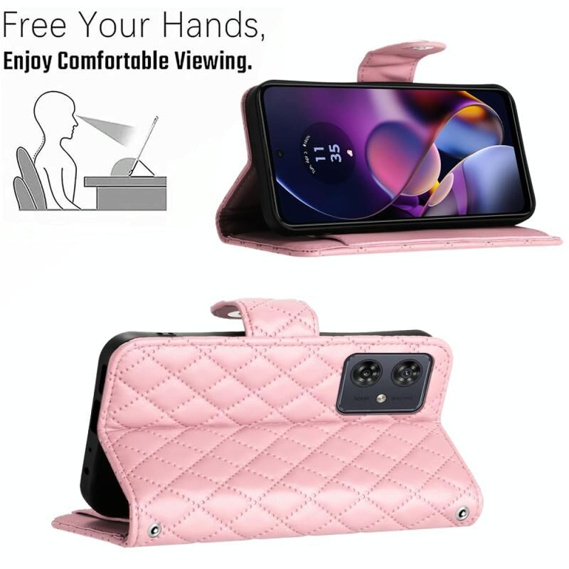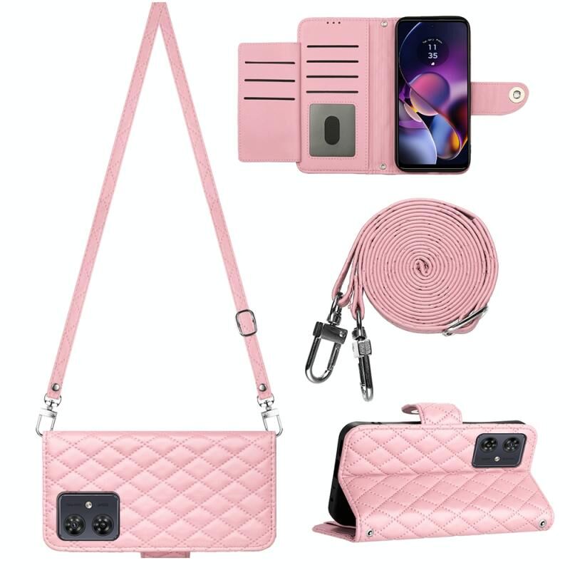 For Motorola Moto G54 Rhombic Texture Flip Leather Phone Case with Long Lanyard(Pink)