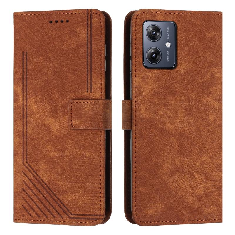 For Motorola Moto G54 Skin Feel Stripe Pattern Leather Phone Case with Lanyard(Brown)