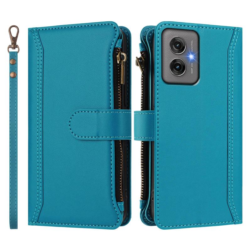 For Motorola Moto G55 5G Magnetic Closure 9 Card Slots Zipper Leather Case with Hand Strap(Turquoise)