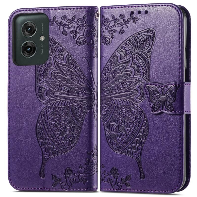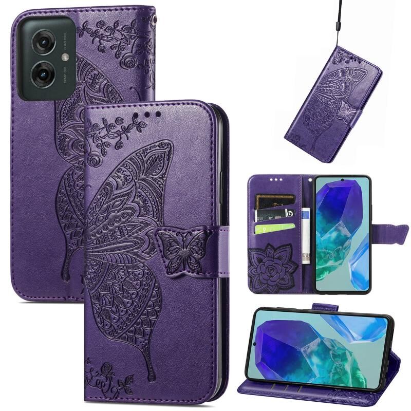 Θήκη τηλεφώνου δερμάτινη ανάγλυφη με σχέδιο πεταλούδας και λουλουδιών για Motorola Moto G55 (Μαύρο)