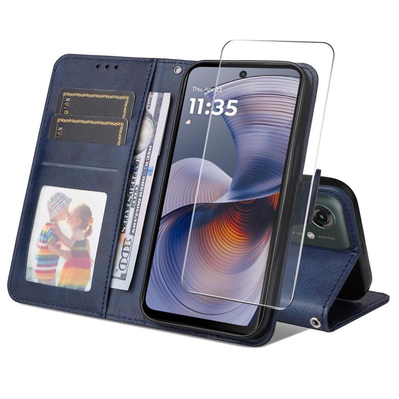 For Motorola Moto G55 ENKAY Card Wallet Calf Texture Leather Phone Case with Screen Film(Blue) (ENKAY)