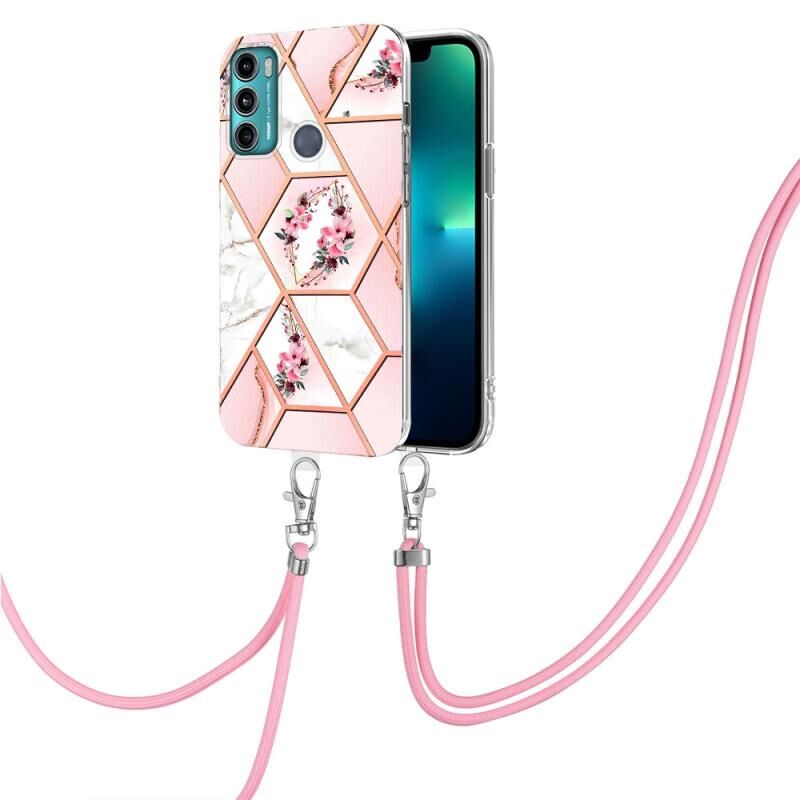 Θήκη κινητού τηλεφώνου TPU με σχέδιο μαρμάρου και λουλουδιών για Motorola Moto G60 / G40 Fusion με κορδόνι (Ροζ Λουλούδι)
