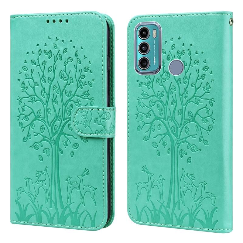 Για Motorola Moto G60 Tree & Deer μοτίβο πιεσμένο εκτύπωση οριζόντια Flip δερμάτινη θήκη τηλεφώνου (πράσινο)