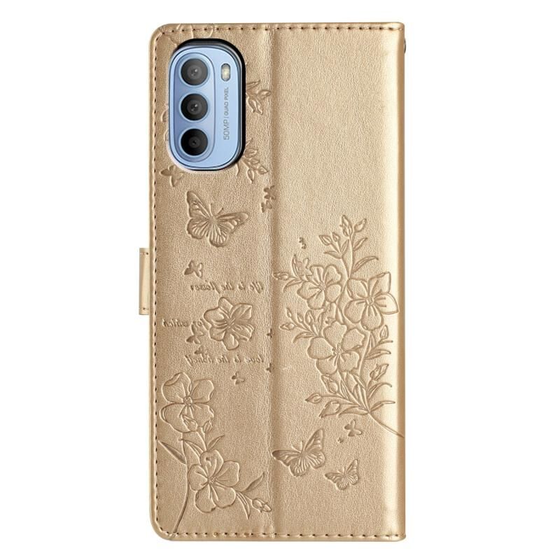 Θήκη τηλεφώνου από δέρμα για Motorola Moto G62 5G, με σχέδια πεταλούδες και λουλούδια (Χρυσό)