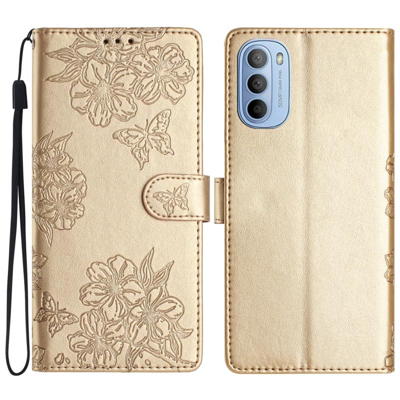 For Motorola Moto G62 5G Cherry Blossom Butterfly Skin Feel Embossed PU Phone Case(Gold)
