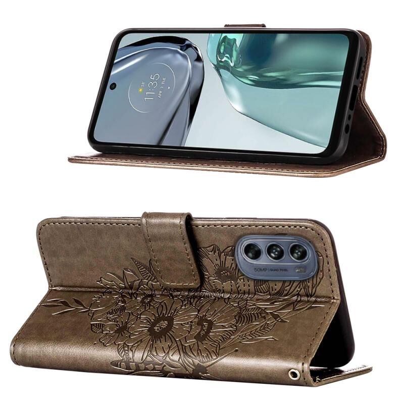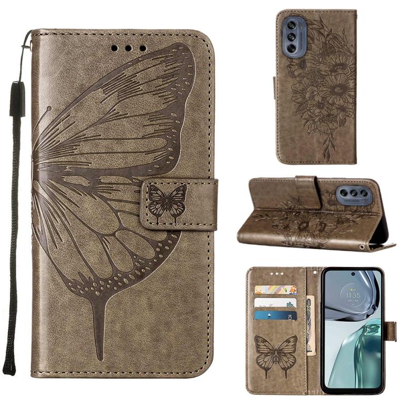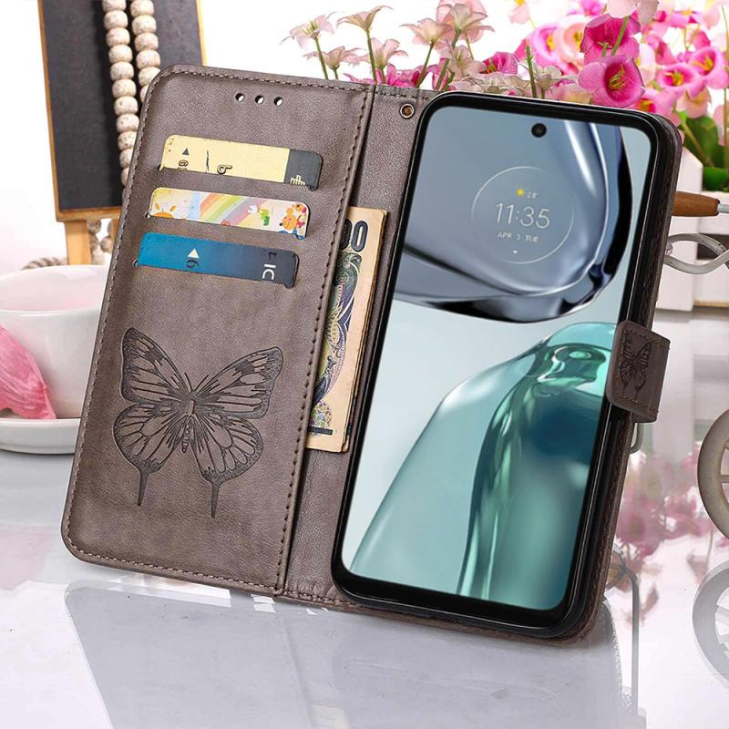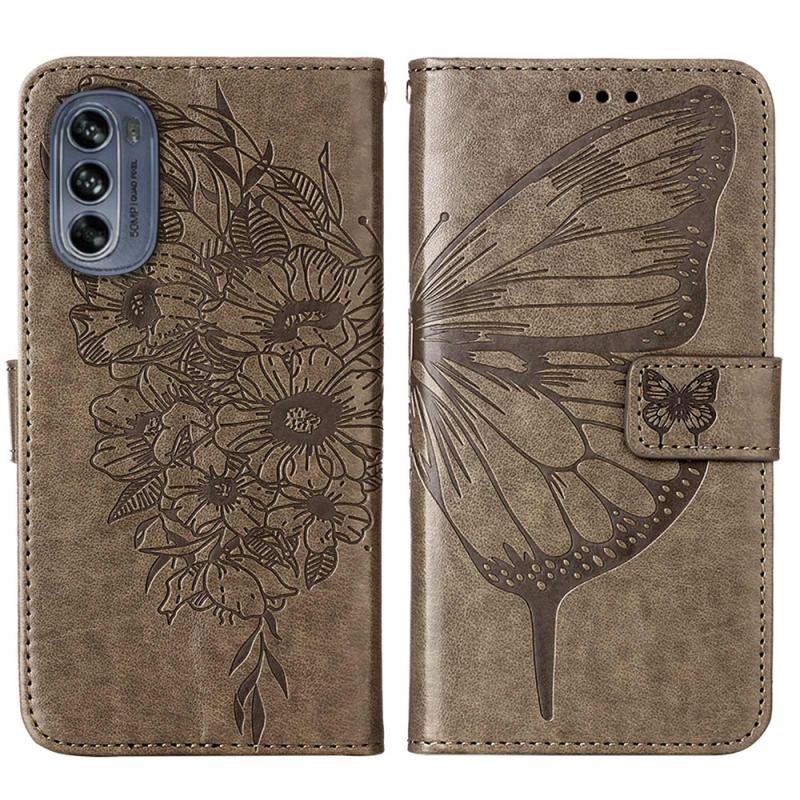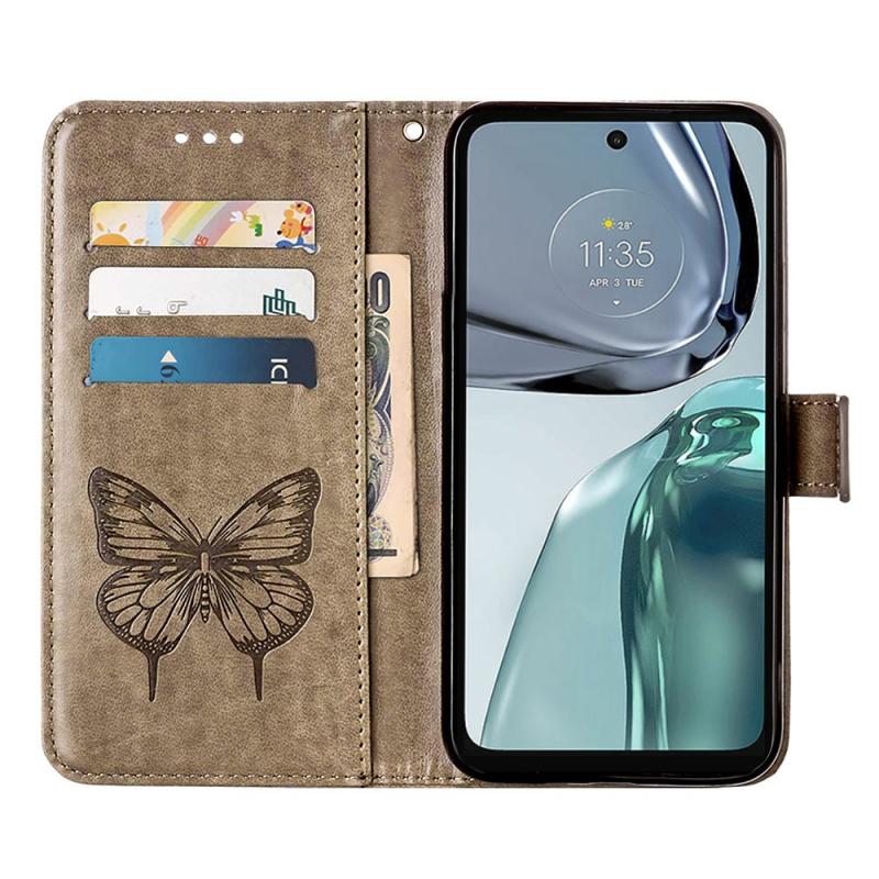 Θήκη τηλεφώνου από δέρμα με ανάγλυφο σχέδιο πεταλούδας και λειτουργία flip για Motorola Moto G62 5G (Γκρι)
