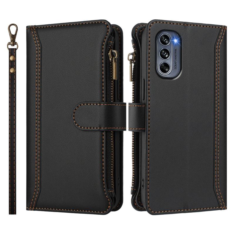 For Motorola Moto G62 5G Global Magnetic Closure 9 Card Slots Zipper Leather Case with Hand Strap(Black)
