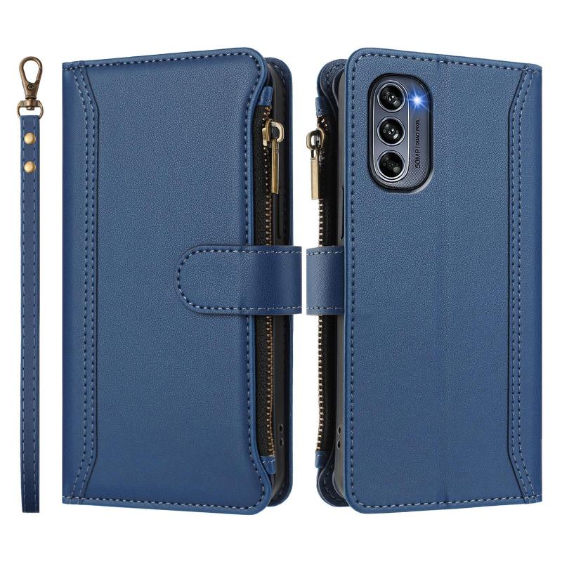 For Motorola Moto G62 5G Global Magnetic Closure 9 Card Slots Zipper Leather Case with Hand Strap(Dark Blue)