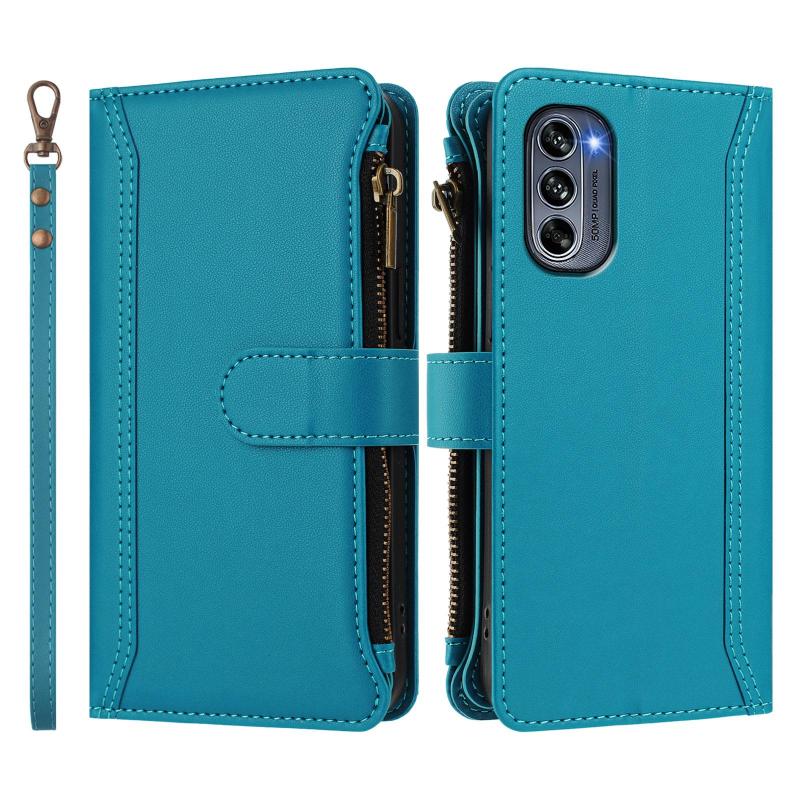 For Motorola Moto G62 5G Global Magnetic Closure 9 Card Slots Zipper Leather Case with Hand Strap(Turquoise)