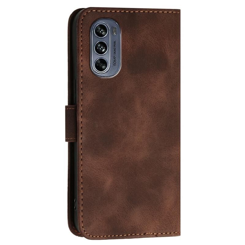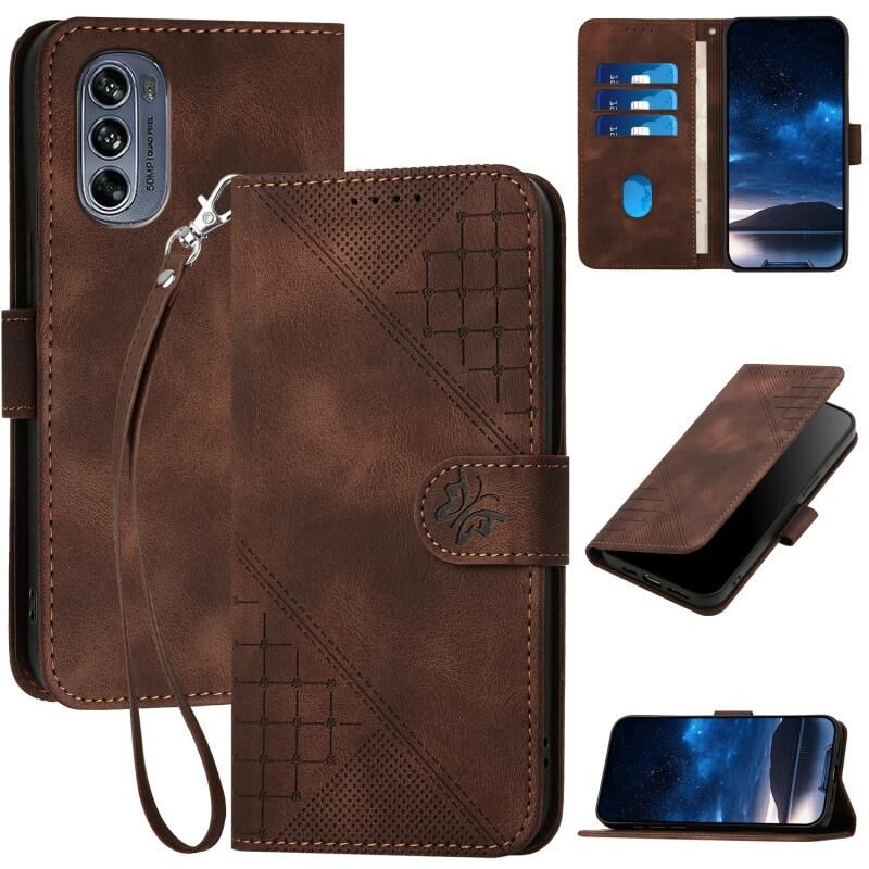 Θήκη κινητού τηλεφώνου δερμάτινη με ανάγλυφο σχέδιο πλέγματος πεταλούδας για Motorola Moto G62 5G με κορδόνι (Καφέ)