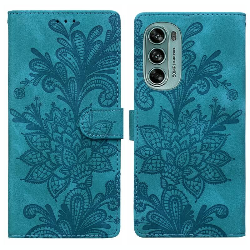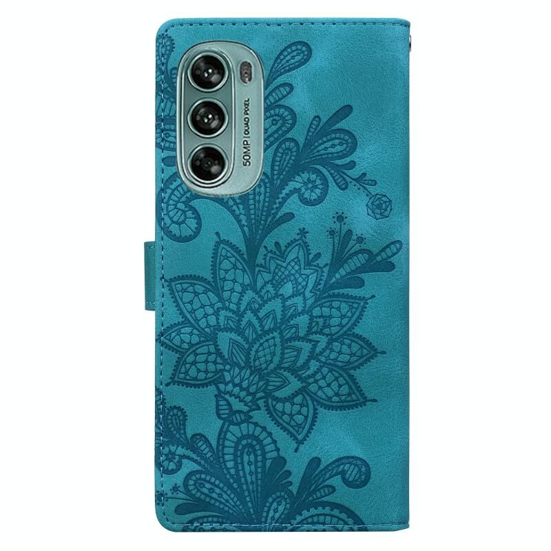 Θήκη κινητού τηλεφώνου Motorola Moto G62 5G από PU με μαγνητικό κούμπωμα, δαντελένιο floral ανάγλυφο και λουρί καρπού (Πράσινο)