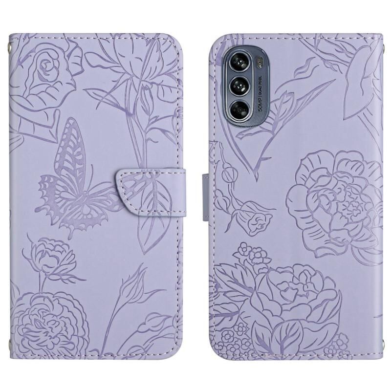 Θήκη κινητού τηλεφώνου από δέρμα με ανάγλυφο σχέδιο πεταλούδας και παιώνιας για Motorola Moto G62 5G (Μαύρο)